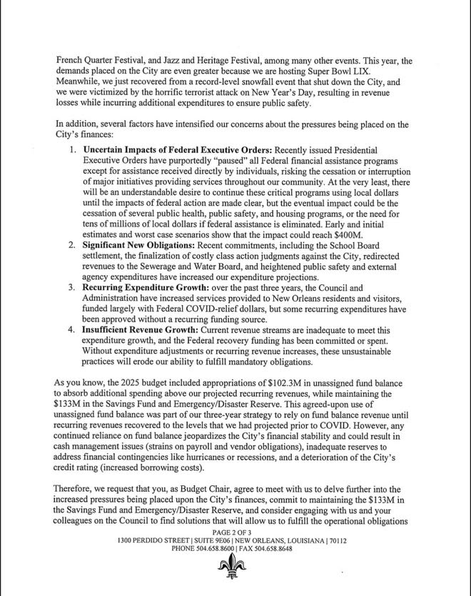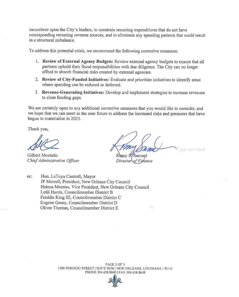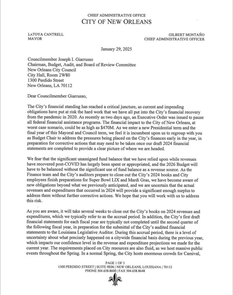 In January 2025, the Cantrell administration formally warned the City Council that New Orleans was facing a “critical juncture.” Then Chief Administrative Officer Gilbert Montaño and Finance Director Romy Samuel sent a three-page letter to Council Budget Chair Joe Giarrusso detailing four urgent threats: the loss of federal funds, costly new legal settlements, unchecked recurring expenses, and weak revenue growth.